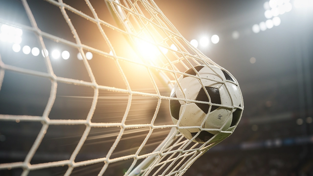 Ballon de football entrant dans les filets d'un but sous une lumière vive de stade